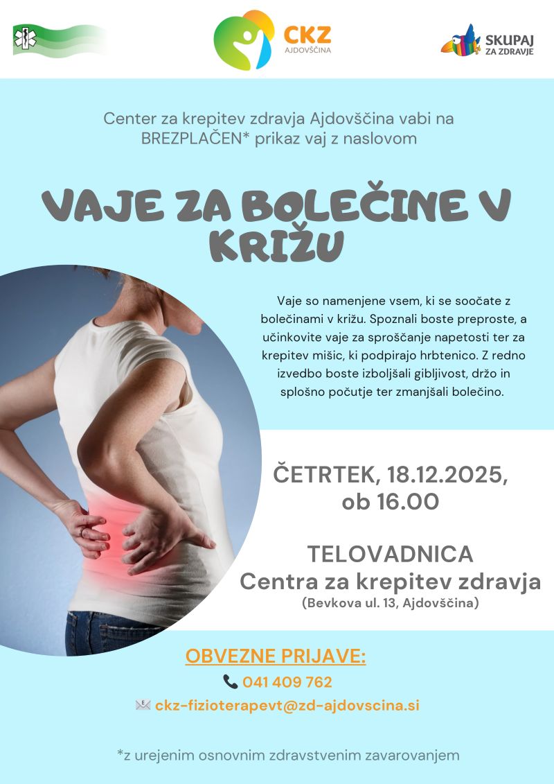 Za udeležbo na delavnici je obvezna predhodna prijava po telefonu na 041 409 762 ali po e-pošti na ckz-fizioterapevt (pri) zd-ajdovscina (pika) si.